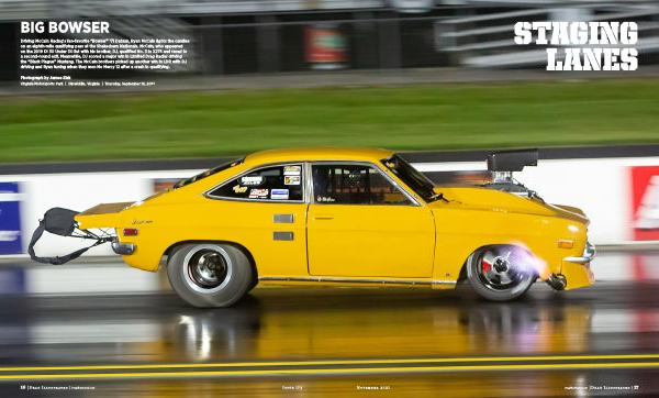Driving McCain Racing ’ s fan-favorite “ Bowser ” ‘ 71 Datsun , Ryan McCain lights the candles on an eighth-mile qualifying pass at the Shakedown Nationals . McCain , who appeared on the 2019 DI 30 Under 30 list with his brother , DJ , qualified No . 3 in X275 and raced to a second-round exit . Meanwhile , DJ scored a major win in Limited Drag Radial driving the “ Black Plague ” Mustang . The McCain brothers picked up another win in LDR with DJ driving and Ryan tuning when they won No Mercy 12 after a crash in qualifying .