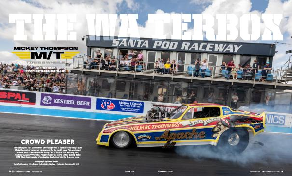 Tim Garlick puts on a show for the nitro-hungry fans at Santa Pod Raceway ’ s Euro Finals Shootout , a temporary replacement for the track ’ s usual FIA-sanctioned national event . Like many of the Funny Cars of the late ‘ 70s and early ‘ 80s , Garlick ’ s “ Apache ” ‘ 77 Pontiac Firebird Funny Car sports a nitro-burning 426ci Keith Black Hemi capable of motivating the hot rod into the 5-second zone .