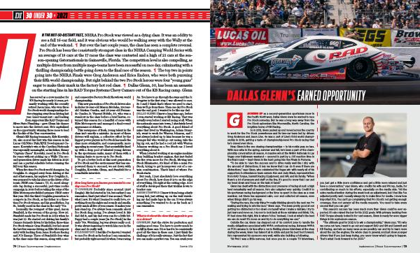 N THE NOT-SO-DISTANT PAST , NHRA Pro Stock was viewed as a dying class . It was an oddity to see a full 16-car field , and it was obvious who would be walking away with the Wally at the end of the weekend . ¶ But over the last couple years , the class has seen a complete reversal . Pro Stock has been the consistently strongest class in the NHRA Camping World Series with an average of 18 cars at the 17 races the class was contested and a high of 21 cars at the season-opening Gatornationals in Gainesville , Florida . The competition level is also compelling , as multiple drivers from multiple mega-teams have been successful on race day , culminating with a thrilling championship battle going down to the final race of the season . ¶ The top two in points going into the NHRA Finals were Greg Anderson and Erica Enders , who were both pursuing their fifth world championship . But right behind the two Pro Stock heroes were four “ young guns ” eager to make their mark in the factory hot rod class . ¶ Dallas Glenn , 30 , has been an assassin on the starting line in his RAD Torque Systems Chevy Camaro out of the KB Racing camp . Glenn