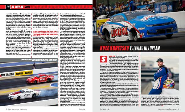 I don ’ t know if there would ever be some way to get other manufacturers or maybe some different body styles in . I know that ’ s one of the common complaints that I see online , that everyone hates that it ’ s just a bunch of Camaros out here . But you really gotta hand it to GM for supporting this class as well as they have . The reason that there ’ s all Chevys in here is just because of the amount of support and availability of parts that there is . It ’ s not that a Dodge can ’ t run with us . I believe that if somebody put the amount of money and time and effort into a Dodge or Ford , it could run just as good as the Chevys . I know that may not be a common belief , but I believe it can . STANFIELD : I think Pro Stock is as healthy as it ’ s been in a long time . I really think the main thing is being able to pay the entertainers a little bit