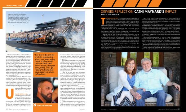 THOUGH JCM RACING co-owner Cathi Maynard passed away on June 23 , 2023 , after a 35-year battle with multiple sclerosis , she made a lasting impact on the world of NHRA drag racing . Her impact is most notable in the pit areas of the JCM Racing teams : Tony Schumacher ’ s Scag Power Equipment Top Fuel team , Tim Wilkerson ’ s Scag Power Equipment Funny Car team , and Justin Ashley ’ s Phillips Connect Top Fuel team .