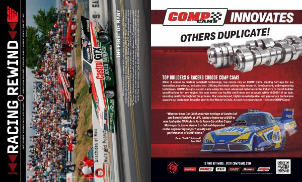 With Kenny Bernstein ’ s “ Budweiser King ” and a whole bunch of Canadian fans watching on in the background , John Force charges down the track while competing at the 1987 Molson NHRA Grandnational outside Montreal . Diehard fans will recognize it as the site of Force ’ s first of 157 NHRA national event victories in Funny Car . With Austin Coil calling the shots on the Castrol GTX / Jolly Rancher Oldsmobile , Force defeated Ed “ The Ace ” McCulloch in the final round to get his long-awaited first win . The TV production crew couldn ’ t get into Canada , so rather than Steve Evans and the Diamond P cameramen , Force was greeted at the top end by “ three drunken Canadians ” as the 16-time NHRA world champion described in a 2020 interview .