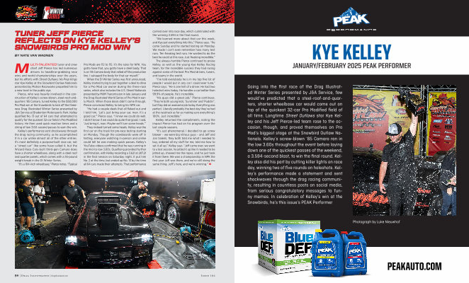 “ It ’ s just phenomenal . I decided to go screw blower – we were big nitrous guys – and Jeff and Jon Salemi , they both told me what I needed to buy , ordered all my stuff for me , told me how to set it all up ,” Kelley says . “ Jeff came over , we went to a test session , he jetted it up like it needed to be jetted up , showed me the ropes , and he just took it from there . We won a championship in NPK the first year Jeff was there , and we ’ re still doing the same thing . Jeff ’ s here , and we ’ re winning .” DI