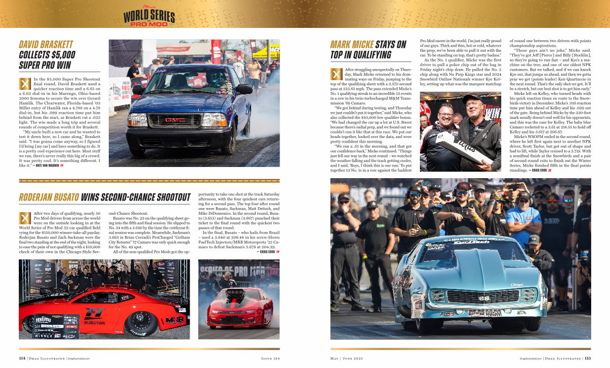 In the $ 5,000 Super Pro Shootout final round, David Braskett used a quicker reaction time and a 6.65 on a 6.63 dial-in in his Marengo, Ohio-based 2000 Sonoma to secure the win over Gerard Hamlik. The Clearwater, Florida-based’ 03 Miller entry of Hamlik ran a 4.788 on a 4.78 dial-in, but his. 099 reaction time put him behind from the start, as Braskett cut a. 023 light. The win made a long trip and several rounds of competition worth it for Braskett.