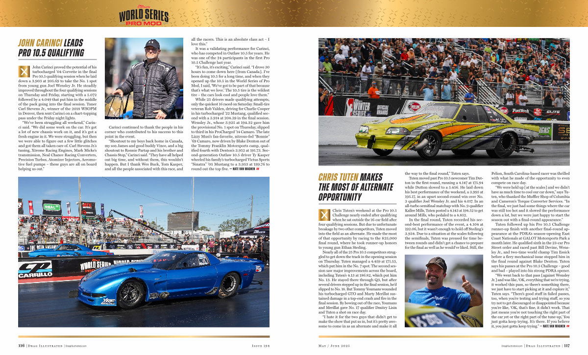 “ It’ s fun, it’ s exciting,” Carinci said.“ I drove 30 hours to come down here [ from Canada ]. I’ ve been doing 10.5 for a long time, and when they opened up the 10.5 in the World Series of Pro Mod, I said,‘ We’ ve got to be part of that because that’ s what we love.’ The 10.5 tire is the wildest tire – the cars look cool and people love them.”