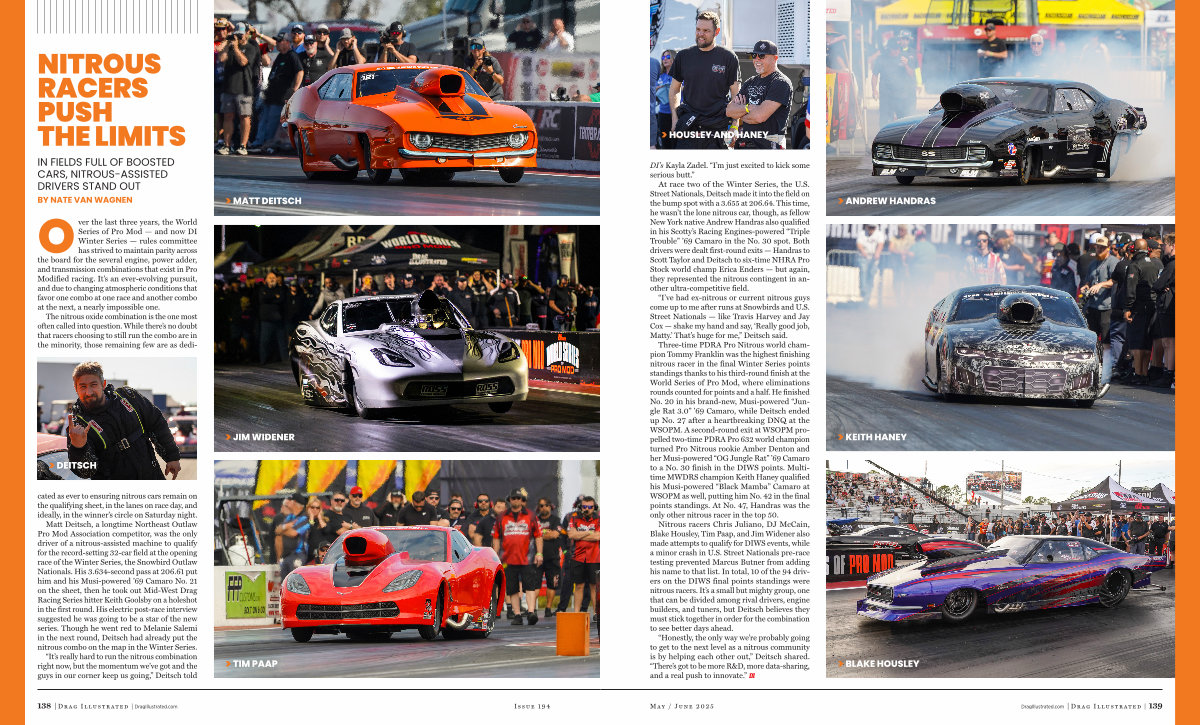 Matt Deitsch, a longtime Northeast Outlaw Pro Mod Association competitor, was the only driver of a nitrous-assisted machine to qualify for the record-setting 32-car field at the opening race of the Winter Series, the Snowbird Outlaw Nationals. His 3.634-second pass at 206.61 put him and his Musi-powered’ 69 Camaro No. 21 on the sheet, then he took out Mid-West Drag Racing Series hitter Keith Goolsby on a holeshot in the first round. His electric post-race interview suggested he was going to be a star of the new series. Though he went red to Melanie Salemi in the next round, Deitsch had already put the nitrous combo on the map in the Winter Series.