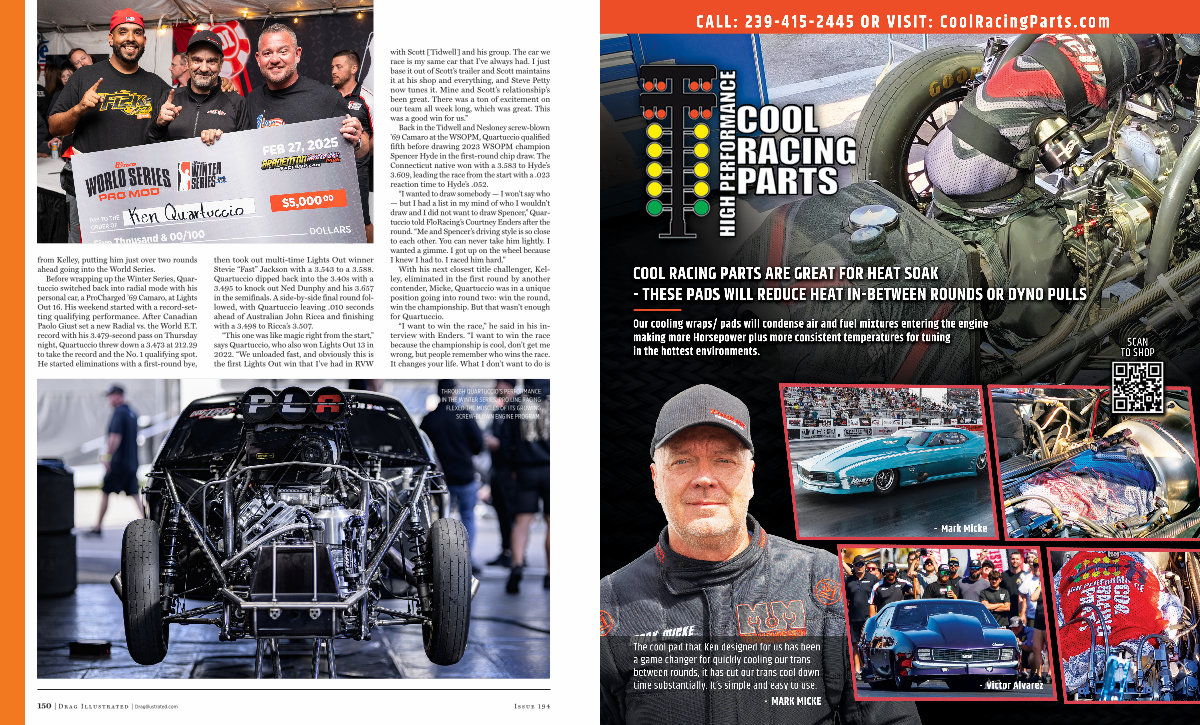 Before wrapping up the Winter Series, Quartuccio switched back into radial mode with his personal car, a ProCharged’ 69 Camaro, at Lights Out 16. His weekend started with a record-setting qualifying performance. After Canadian Paolo Giust set a new Radial vs. the World E. T. record with his 3.479-second pass on Thursday night, Quartuccio threw down a 3.473 at 212.29 to take the record and the No. 1 qualifying spot. He started eliminations with a first-round bye, then took out multi-time Lights Out winner Stevie“ Fast” Jackson with a 3.543 to a 3.588. Quartuccio dipped back into the 3.40s with a 3.495 to knock out Ned Dunphy and his 3.657 in the semifinals. A side-by-side final round followed, with Quartuccio leaving. 010 seconds ahead of Australian John Ricca and finishing with a 3.498 to Ricca’ s 3.507.