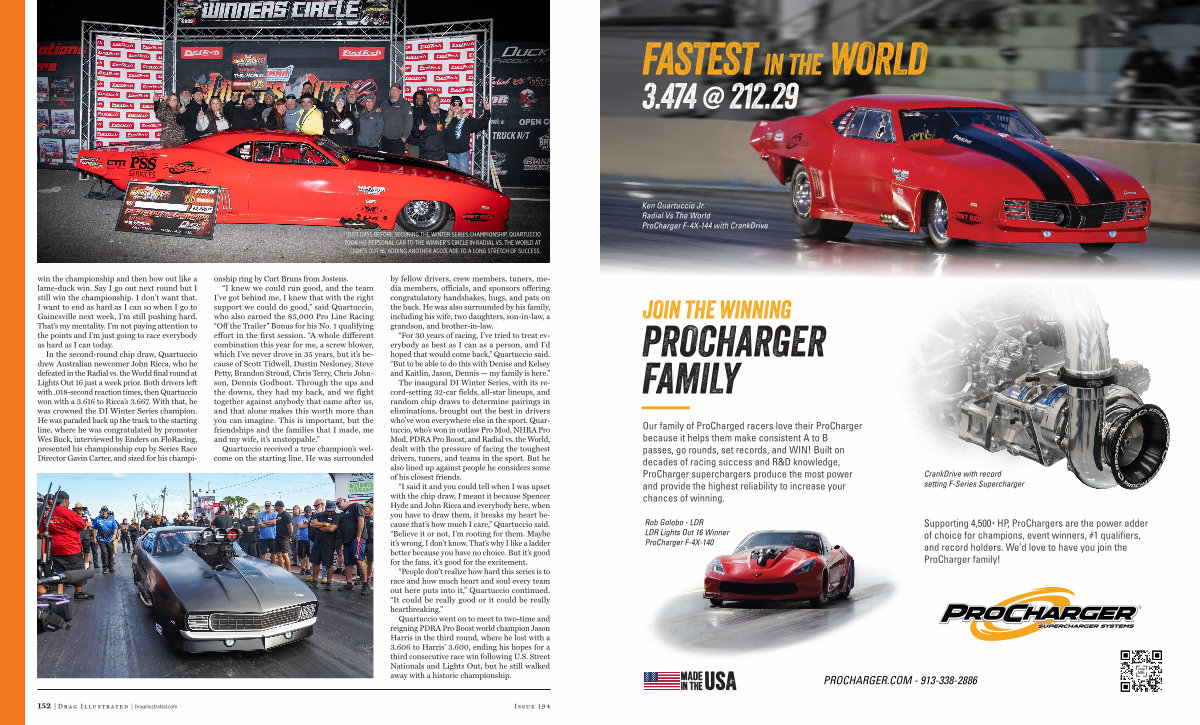 In the second-round chip draw, Quartuccio drew Australian newcomer John Ricca, who he defeated in the Radial vs. the World final round at Lights Out 16 just a week prior. Both drivers left with. 018-second reaction times, then Quartuccio won with a 3.616 to Ricca’ s 3.667. With that, he was crowned the DI Winter Series champion. He was paraded back up the track to the starting line, where he was congratulated by promoter Wes Buck, interviewed by Enders on FloRacing, presented his championship cup by Series Race Director Gavin Carter, and sized for his championship ring by Curt Bruns from Jostens.