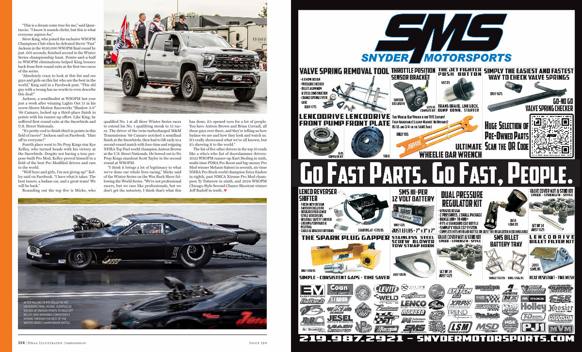 Rounding out the top five is Micke, who qualified No. 1 at all three Winter Series races to extend his No. 1 qualifying streak to 13 races. The driver of the twin-turbocharged M & M Transmission’ 69 Camaro notched a semifinal finish at the Snowbirds, then had to lift early in a second-round match with four-time and reigning NHRA Top Fuel world champion Antron Brown at the U. S. Street Nationals. He bowed out to No Prep Kings standout Scott Taylor in the second round at WSOPM.