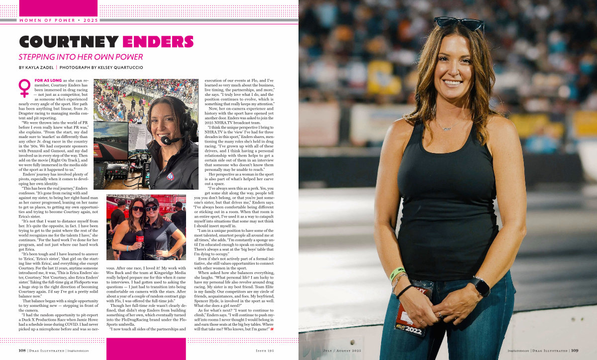 FOR AS LONG as she can remember, Courtney Enders has been immersed in drag racing— not just as a competitor, but as someone who’ s experienced nearly every angle of the sport. Her path has been anything but linear, from Jr. Dragster racing to managing media content and pit reporting.