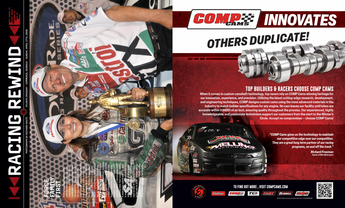 Following a final-round battle with her father, Funny Car icon John Force, Ashley Force Hood celebrates her first career Funny Car win in the winner’ s circle with her dad, who was chasing the 1,000-round-win milestone at the time. The win made Ashley the first woman to win in the category. Since then, Melanie Troxel, Alexis DeJoria, and Ashley’ s youngest sister, Courtney Force, have joined her as female Funny Car winners. Becoming the first woman to win in the class was significant to Force Hood, but the timing of the victory— just a handful of races into the season following teammate Eric Medlen’ s fatal crash in early 2007 and her father’ s devastating crash at Dallas later that season – made it even more significant.“ To have a really happy moment at the track with my team, that is what made that day most special,” Force Hood said on the 10-year anniversary of the win in 2018.“ And to get to compete against my father in the final round was really exciting.”