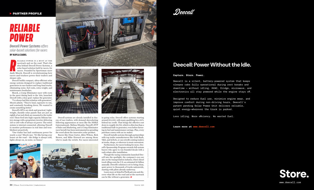Reliable power is a must at the racetrack and on the road. That’ s the idea behind Deecell Power Systems, a solar-based solution built by racers, for racers. Founded by Sportsman racer Andy Moeck, Deecell is revolutionizing how racers and truckers power their trailers and sleeper cabs.