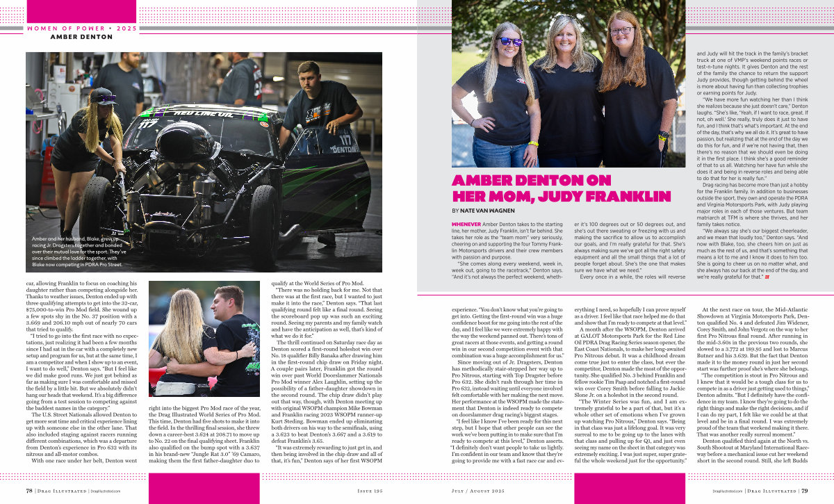With one race under her belt, Denton went right into the biggest Pro Mod race of the year, the Drag Illustrated World Series of Pro Mod. This time, Denton had five shots to make it into the field. In the thrilling final session, she threw down a career-best 3.624 at 208.71 to move up to No. 22 on the final qualifying sheet. Franklin also qualified on the bump spot with a 3.637 in his brand-new“ Jungle Rat 3.0”’ 69 Camaro, making them the first father-daughter duo to qualify at the World Series of Pro Mod.