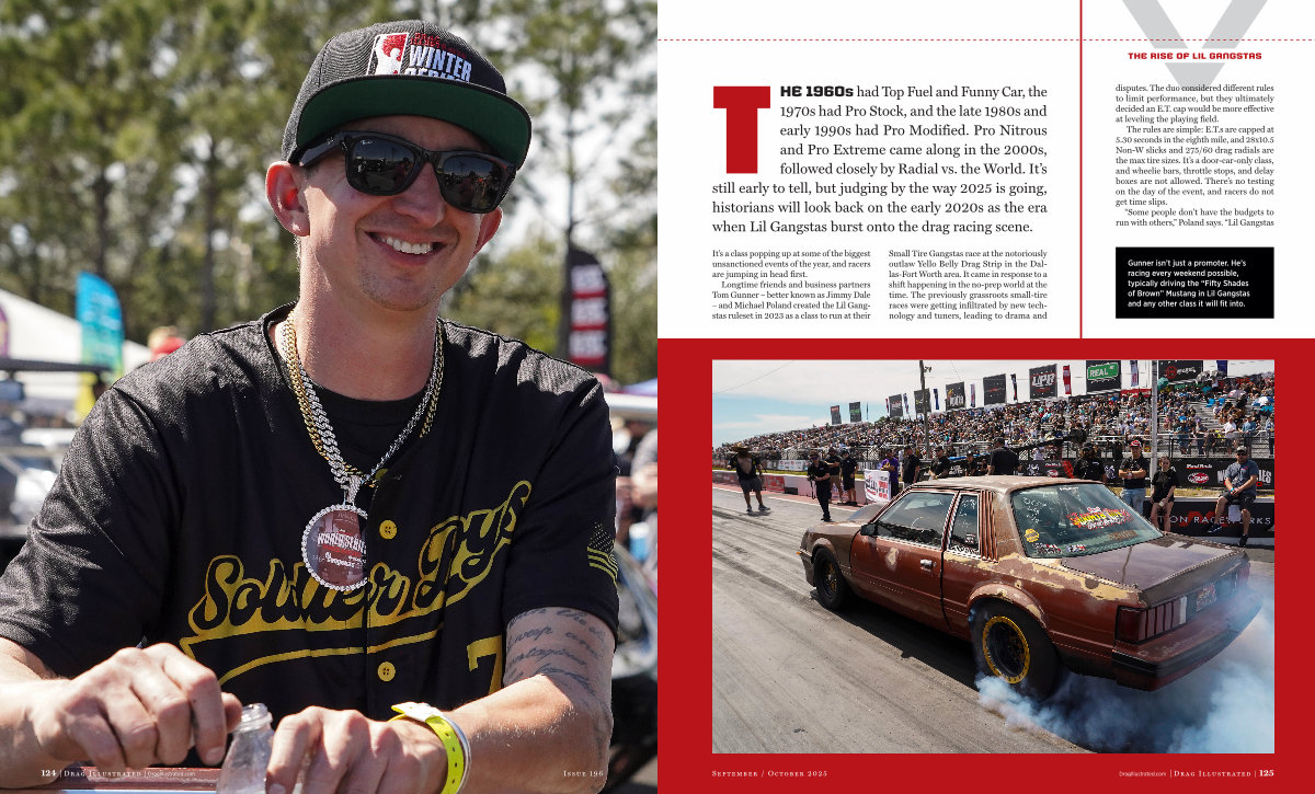 THE 1960S had Top Fuel and Funny Car, the 1970s had Pro Stock, and the late 1980s and early 1990s had Pro Modified. Pro Nitrous and Pro Extreme came along in the 2000s, followed closely by Radial vs. the World. It’ s still early to tell, but judging by the way 2025 is going, historians will look back on the early 2020s as the era when Lil Gangstas burst onto the drag racing scene. disputes. The duo considered different rules to limit performance, but they ultimately decided an E. T. cap would be more effective at leveling the playing field.