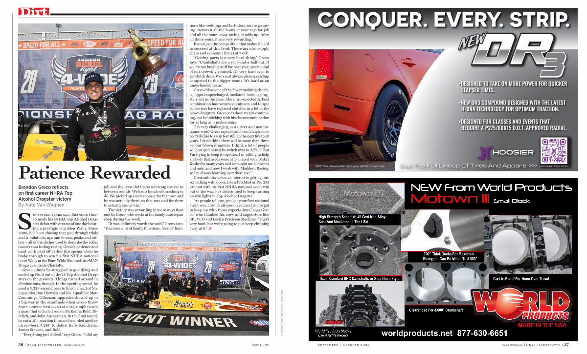 “ As people tell me, you get your first national event win, now it’ s all eyes on you and you’ ve got to keep up with those expectations,” says Greco, who thanked his crew and supporters like SPEVCO and Lesleh Precision Machine.“ That’ s very hard, but we’ re going to just keep chipping away at it.” DI