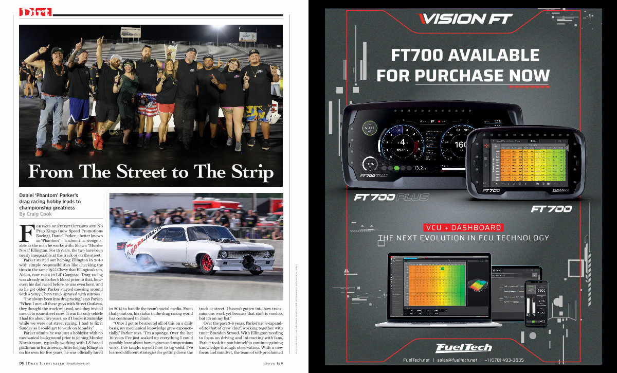 For fans of Street Outlaws and No Prep Kings( now Speed Promotions Racing), Daniel Parker – better known as“ Phantom” – is almost as recognizable as the man he works with: Shawn“ Murder Nova” Ellington. For 15 years, the two have been nearly inseparable at the track or on the street. Parker started out helping Ellington in 2010 with simple responsibilities like checking the tires in the same 1955 Chevy that Ellington’ s son, Aiden, now races in Lil’ Gangstas. Drag racing was already in Parker’ s blood prior to that, however; his dad raced before he was even born, and as he got older, Parker started messing around with a 2007 Chevy truck sprayed with nitrous.