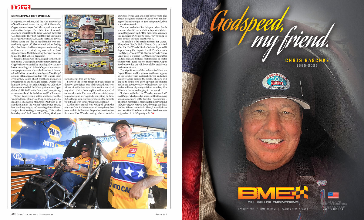 “ I played with the Hot Wheels cars as a kid,” said Capps, who hinted at some cool forthcoming announcements.“ I got to drive for [ Prudhomme ]. The most memorable moment for me is winning Indy, the biggest race we have, driving a car that’ s the Hot Wheels throwback. Then, I actually have a car as a Hot Wheels set with Don Prudhomme’ s original car in it. It’ s pretty wild.” DI