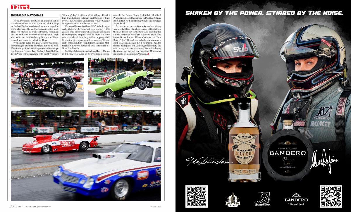 As the sun set on the Kentucky skyline, giving way to cobalt blue of night, a parade of blasts from the past towed out to the two-lane blacktop for a nitro nightcap Nostalgia Nationals style. The iconic Bruce Larson USA-1 Camaro, the“ Fun Bunch” AA / FD, and several other seldom seen East Coast cackle cars fired in unison, header flames licking the sky. A fitting celebration, the nitro pomp and circumstance of Kentucky closing the event, leaving just one question: How many days until we do it again? Cheers. DI