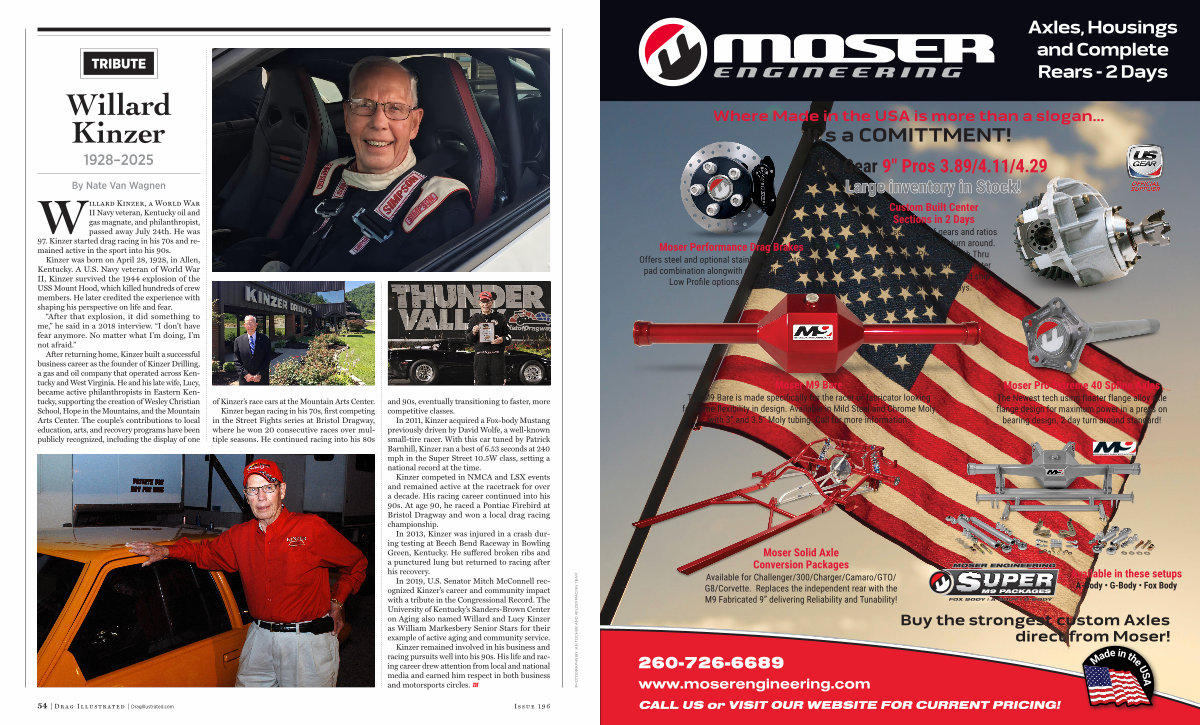 Willard Kinzer, a World War II Navy veteran, Kentucky oil and gas magnate, and philanthropist, passed away July 24th. He was 97. Kinzer started drag racing in his 70s and remained active in the sport into his 90s. Kinzer was born on April 28, 1928, in Allen, Kentucky. A U. S. Navy veteran of World War II, Kinzer survived the 1944 explosion of the USS Mount Hood, which killed hundreds of crew members. He later credited the experience with shaping his perspective on life and fear.