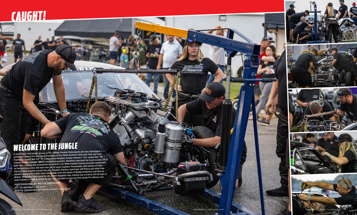 A multi-team mad thrash ensues in the Tommy Franklin Motorsports pit area following a semifinal round of Pro Nitrous competition at the PDRA Northern Nationals that saw both Franklin’ s“ Jungle Rat 3.0”’ 69 Camaro and daughter Amber Denton’ s“ OG Jungle Rat”’ 69 Camaro sustain damage due to mechanical gremlins. Backfires launched the hood scoops off of both cars, cracking the windshield on Denton’ s car. With Franklin having wounded equipment on two previous runs, the team was out of spare engines. Fortunately, with plenty of other big-inch Musi engines around the pits, Franklin, Denton, and tuner Jeff Pierce got what they needed, along with a little extra manpower, from the teams of Buddy Perkinson and Marcus Butner. In the first final round for the father-daughter duo, Denton ran a 5.44 at 147.49 mph to beat Franklin’ s 5.468 at 149.01 by just. 006 seconds to earn her first career Pro Nitrous win.