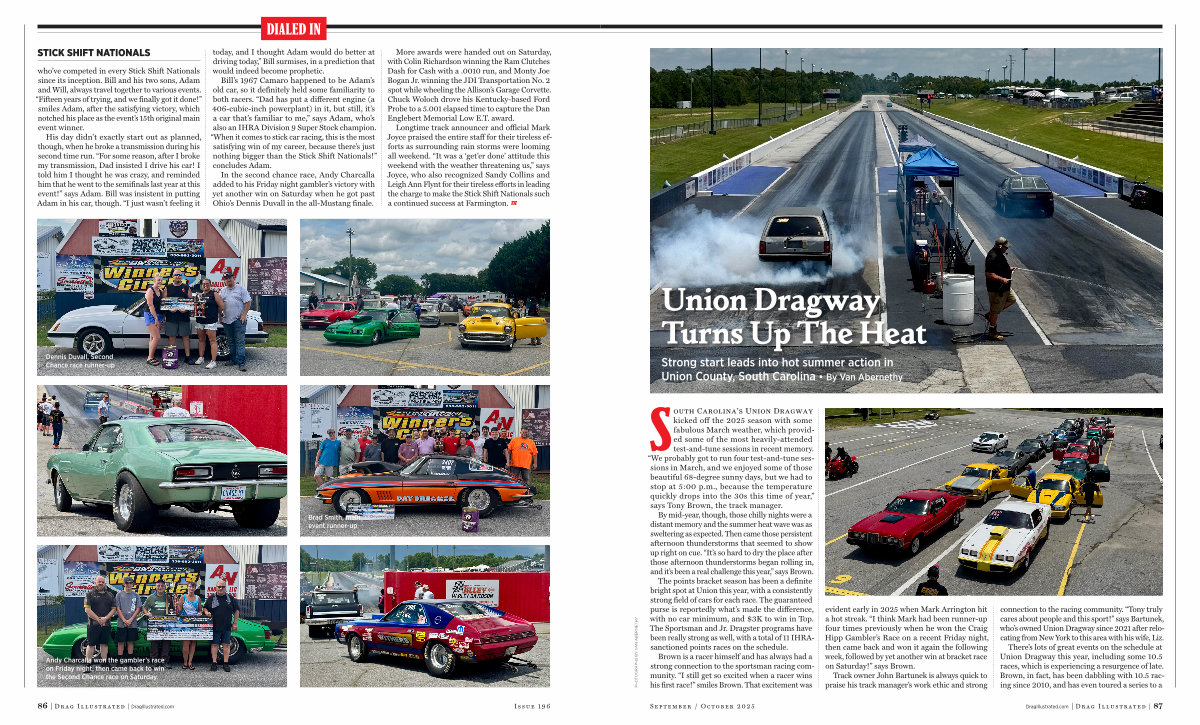 South Carolina’ s Union Dragway kicked off the 2025 season with some fabulous March weather, which provided some of the most heavily-attended test-and-tune sessions in recent memory.“ We probably got to run four test-and-tune sessions in March, and we enjoyed some of those beautiful 68-degree sunny days, but we had to stop at 5:00 p. m., because the temperature quickly drops into the 30s this time of year,” says Tony Brown, the track manager. By mid-year, though, those chilly nights were a distant memory and the summer heat wave was as sweltering as expected. Then came those persistent afternoon thunderstorms that seemed to show up right on cue.“ It’ s so hard to dry the place after those afternoon thunderstorms began rolling in, and it’ s been a real challenge this year,” says Brown.