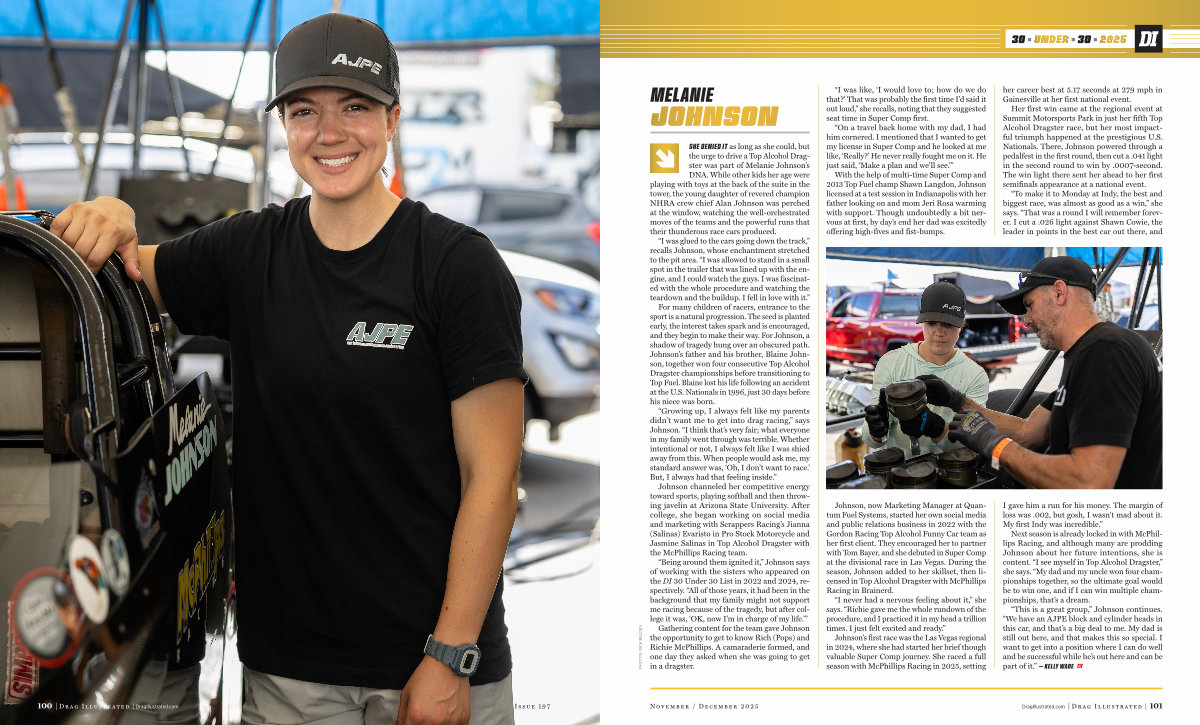 Next season is already locked in with McPhillips Racing, and although many are prodding Johnson about her future intentions, she is content.“ I see myself in Top Alcohol Dragster,” she says.“ My dad and my uncle won four championships together, so the ultimate goal would be to win one, and if I can win multiple championships, that’ s a dream.