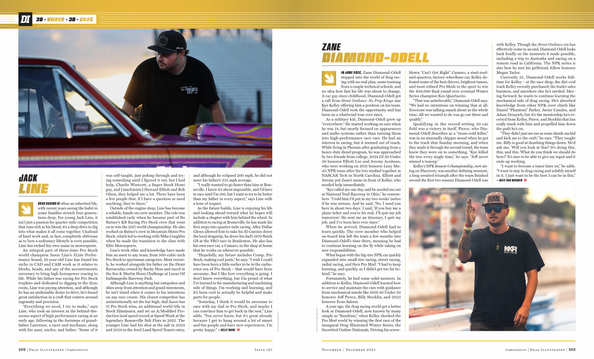 IN JUNE 2022, Zane Diamond-Odell stepped into the world of drag racing with no real plan, some training from a couple technical schools, and no idea how fast his life was about to change. A car guy since childhood, Diamond-Odell got a call from Street Outlaws: No Prep Kings star Kye Kelley offering him a position on his team. Diamond-Odell took the opportunity and has been on a whirlwind tour ever since.