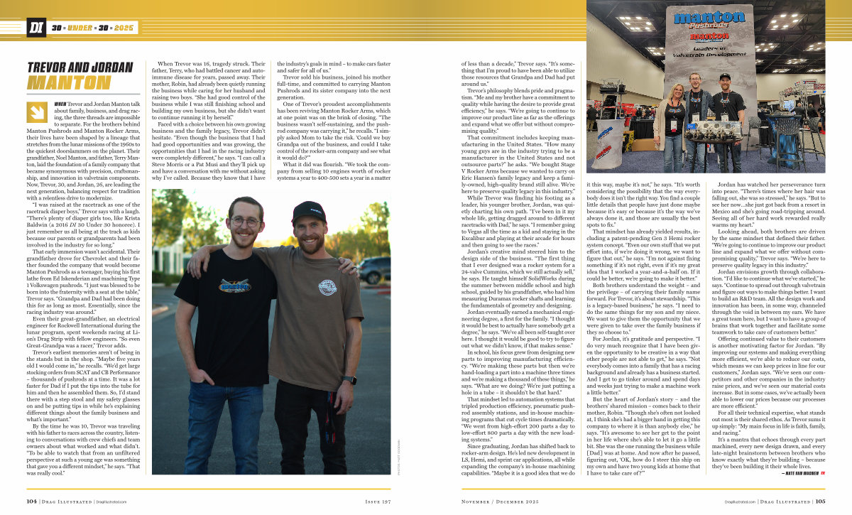TREVOR AND JORDANMANTON WHEN Trevor and Jordan Manton talk about family, business, and drag racing, the three threads are impossible to separate. For the brothers behind Manton Pushrods and Manton Rocker Arms, their lives have been shaped by a lineage that stretches from the lunar missions of the 1960s to the quickest doorslammers on the planet. Their grandfather, Noel Manton, and father, Terry Manton, laid the foundation of a family company that became synonymous with precision, craftsmanship, and innovation in valvetrain components. Now, Trevor, 30, and Jordan, 26, are leading the next generation, balancing respect for tradition with a relentless drive to modernize.