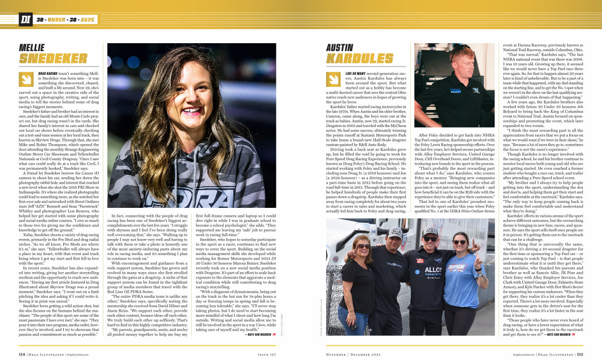 Snedeker, who hopes to someday participate in the sport as a racer, continues to find new ways to cover the sport. Building on the social media management skills she developed while working for Butner Motorsports and 2023 DI 30 Under 30 honoree Marcus Butner, Snedeker recently took on a new social media position with Dragzine. It’ s part of an effort to scale back exposure to the elements that aggravate a medical condition while still contributing to drag racing’ s storytelling.