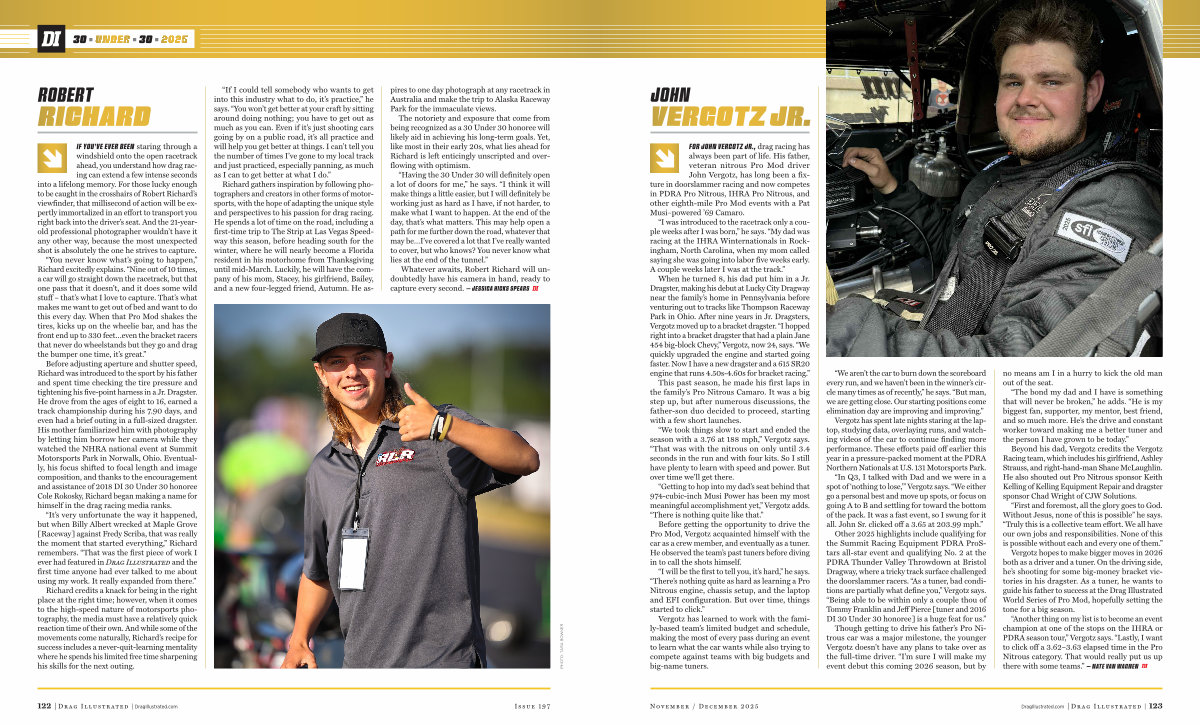 Before adjusting aperture and shutter speed, Richard was introduced to the sport by his father and spent time checking the tire pressure and tightening his five-point harness in a Jr. Dragster. He drove from the ages of eight to 16, earned a track championship during his 7.90 days, and even had a brief outing in a full-sized dragster. His mother familiarized him with photography by letting him borrow her camera while they watched the NHRA national event at Summit Motorsports Park in Norwalk, Ohio. Eventually, his focus shifted to focal length and image composition, and thanks to the encouragement and assistance of 2018 DI 30 Under 30 honoree Cole Rokosky, Richard began making a name for himself in the drag racing media ranks.