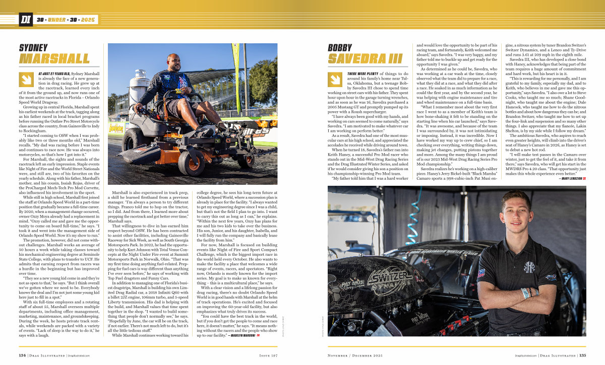 AT JUST 27 YEARS OLD, Sydney Marshall is already the face of a new generation in drag racing. He grew up at the racetrack, learned every inch of it from the ground up, and now runs one of the most active racetracks in Florida – Orlando Speed World Dragway.
