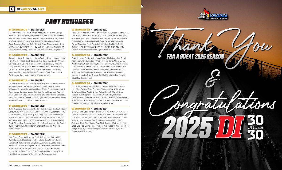 Vincent Nobile, Leah Pruett, Justen Moser, Kirk Wolf, Mark Savage, Mia Tedesco, Rickie Jones, Megan Fessel Schumacher, Cameron Ferré, Matt Sackman, Daniel Pharris, Preston Tanner, Audrey Worm, Steven Whiteley, Jonnie Lindberg, Kyle Dvorak, Tera Wendland-Graves, Jared Johnston, Donovan Stott, Brittany Force, Tyler Crossnoe, Drew Skillman, Ashley Sanford, John Paul Gutierrez, Jon Schaffer, PJ North, Corey Michalek, Jimmy Sackuvich, Lizzy Musi and Troy Coughlin Jr.