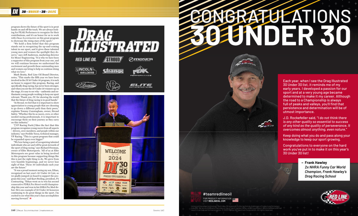 Mark Beatty, Red Line Oil Brand Director, notes,“ This marks the fifth year we have been involved in the DI 30 Under 30 program; it is such an honor to support this program. Racing, and specifically drag racing, has never been stronger, and when you see the 30 Under 30 winners up on the stage, it’ s easy to see why – authentic and enthusiastic young people working to keep our sport relevant. Thank you, DI, for showing the world that the future of drag racing is in good hands.”