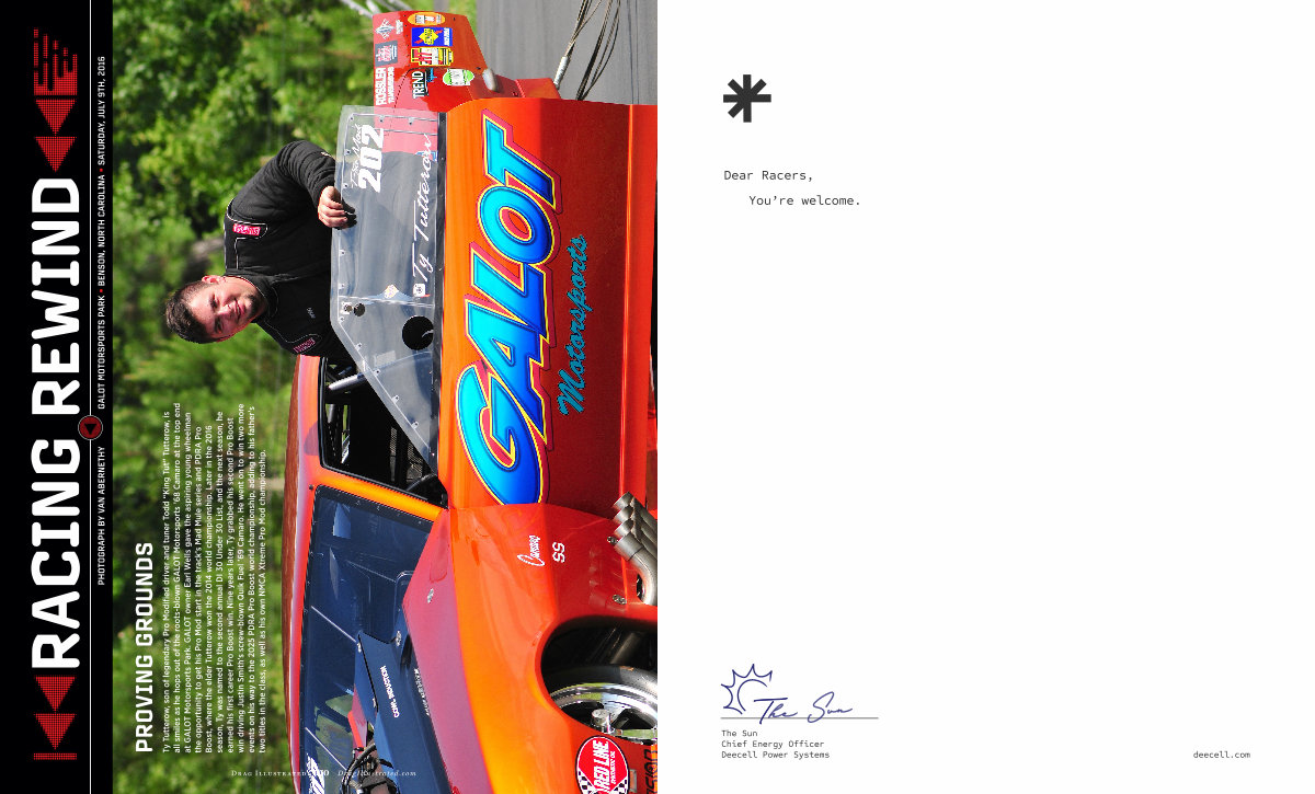 Ty Tutterow, son of legendary Pro Modified driver and tuner Todd“ King Tut” Tutterow, is all smiles as he hops out of the roots-blown GALOT Motorsports’ 68 Camaro at the top end at GALOT Motorsports Park. GALOT owner Earl Wells gave the aspiring young wheelman the opportunity to get his Pro Mod start in the track’ s Mad Mule series and PDRA Pro Boost, where the elder Tutterow won the 2014 world championship. Later in the 2016 season, Ty was named to the second annual DI 30 Under 30 List, and the next season, he earned his first career Pro Boost win. Nine years later, Ty grabbed his second Pro Boost win driving Justin Smith’ s screw-blown Quik Fuel’ 69 Camaro. He went on to win two more events on his way to the 2025 PDRA Pro Boost world championship, adding to his father’ s two titles in the class, as well as his own NMCA Xtreme Pro Mod championship.