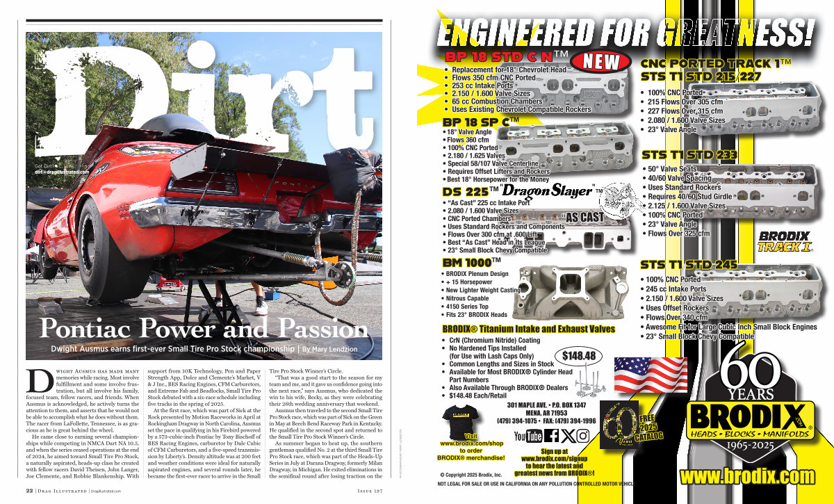 Dwight Ausmus has made many memories while racing. Most involve fulfillment and some involve frustration, but all involve his family, focused team, fellow racers, and friends. When Ausmus is acknowledged, he actively turns the attention to them, and asserts that he would not be able to accomplish what he does without them. The racer from LaFollette, Tennessee, is as gracious as he is great behind the wheel. He came close to earning several championships while competing in NMCA Dart NA 10.5, and when the series ceased operations at the end of 2024, he aimed toward Small Tire Pro Stock, a naturally aspirated, heads-up class he created with fellow racers David Theisen, John Langer, Joe Clemente, and Robbie Blankenship. With