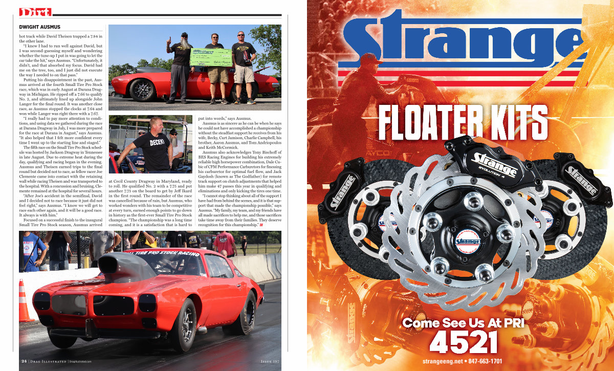 at Cecil County Dragway in Maryland, ready to roll. He qualified No. 2 with a 7.75 and put another 7.75 on the board to get by Jeff Ikard in the first round. The remainder of the race was cancelled because of rain, but Ausmus, who worked wonders with his team to be competitive at every turn, earned enough points to go down in history as the first-ever Small Tire Pro Stock champion.“ The championship was a long time coming, and it is a satisfaction that is hard to put into words,” says Ausmus.