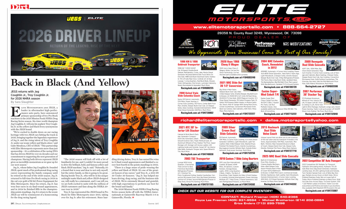 Elite Motorsports and JEGS, a leader in aftermarket high-performance auto parts, have announced primary sponsorship of two Pro Stock machines in the 2026 Mission Foods NHRA Drag Racing Series season. Six-time world champion Jeg Coughlin Jr. will join his nephew Troy Coughlin Jr. in the yellow and black livery synonymous with the JEGS brand.“ We’ re excited to double down on our racing heritage with two JEGS cars hitting the track in 2026, bringing together the legendary experience of Jeg Jr. and the rising talent of Troy Coughlin Jr. under our iconic yellow and black colors,” said Gabe Mendoza, CEO of JEGS.“ This partnership with Elite Motorsports represents more than just sponsorship – it’ s a celebration of the racing DNA that has driven JEGS for over six decades and our commitment to supporting the next generation of champions. Having both drivers represent JEGS gives us incredible momentum as we gear up for our next season.”