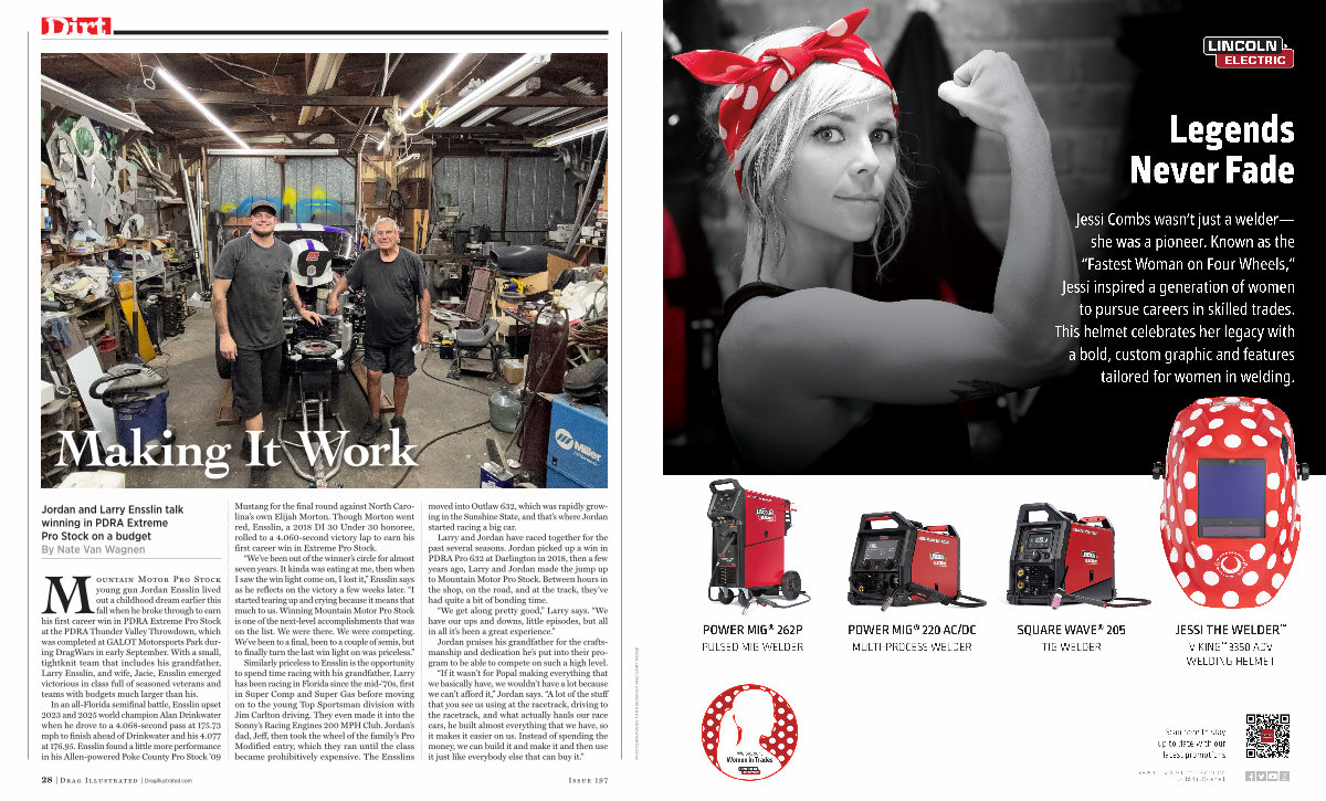 Mountain Motor Pro Stock young gun Jordan Ensslin lived out a childhood dream earlier this fall when he broke through to earn his first career win in PDRA Extreme Pro Stock at the PDRA Thunder Valley Throwdown, which was completed at GALOT Motorsports Park during DragWars in early September. With a small, tightknit team that includes his grandfather, Larry Ensslin, and wife, Jacie, Ensslin emerged victorious in class full of seasoned veterans and teams with budgets much larger than his. In an all-Florida semifinal battle, Ensslin upset 2023 and 2025 world champion Alan Drinkwater when he drove to a 4.068-second pass at 175.73 mph to finish ahead of Drinkwater and his 4.077 at 176.95. Ensslin found a little more performance in his Allen-powered Poke County Pro Stock’ 09