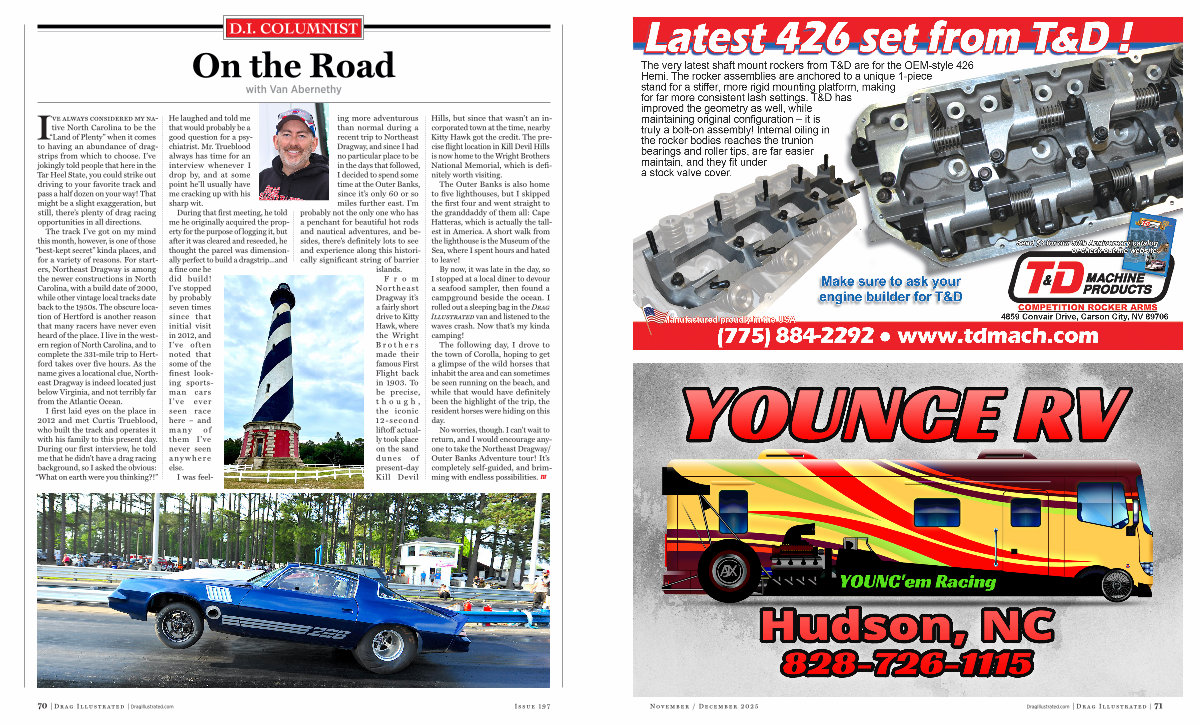 F r o m Northeast Dragway it’ s a fairly short drive to Kitty Hawk, where the Wright Brothers made their famous First Flight back in 1903. To be precise, though, the iconic 12-second liftoff actually took place on the sand