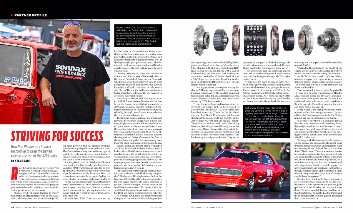 Getting down track is the bare minimum a racer needs to be successful and it’ s also the foundation that is built upon when the goals are going quicker and faster. Rhodes’ switch to the Sonnax Smart-Tech drum module has provided him with that foundation, one that he has built upon and made his legendary Camaro quicker and faster than it has ever been. DI