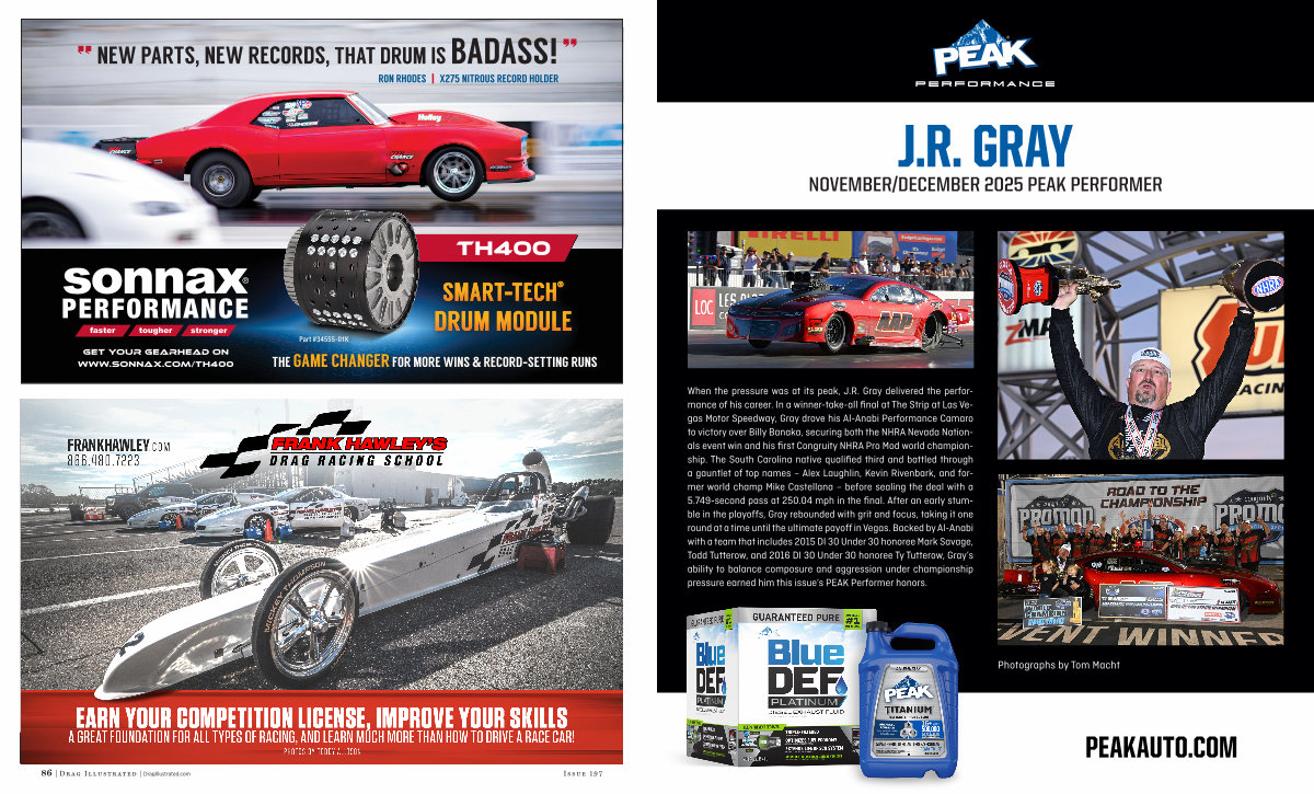 When the pressure was at its peak, J. R. Gray delivered the performance of his career. In a winner-take-all final at The Strip at Las Vegas Motor Speedway, Gray drove his Al-Anabi Performance Camaro to victory over Billy Banaka, securing both the NHRA Nevada Nationals event win and his first Congruity NHRA Pro Mod world championship. The South Carolina native qualified third and battled through a gauntlet of top names – Alex Laughlin, Kevin Rivenbark, and former world champ Mike Castellana – before sealing the deal with a 5.749-second pass at 250.04 mph in the final. After an early stumble in the playoffs, Gray rebounded with grit and focus, taking it one round at a time until the ultimate payoff in Vegas. Backed by Al-Anabi with a team that includes 2015 DI 30 Under 30 honoree Mark Savage, Todd Tutterow, and 2016 DI 30 Under 30 honoree Ty Tutterow, Gray’ s ability to balance composure and aggression under championship pressure earned him this issue’ s PEAK Performer honors.