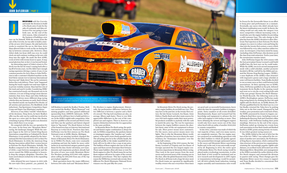 Jeff Hoskins to match the Bealkos’ Pontiac. Both cars carried the Bealkos’“ Black Diamond” coal mining graphics and later gained additional sponsorship from AMSOIL lubricants. DeFlorian proved he still knew how to build and drive a car. In the ADRL’ s eighth-mile competition, John was low qualifier at his second and third events and then ran the quickest and fastest elapsed times in“ big motor” Pro Stock history in front of his hometown fans at Gateway International Raceway at 4.019 / 179.95. Fourteen days later, DeFlorian won his first sixteen-car Pro Stock National event at ADRL Martin, Michigan.