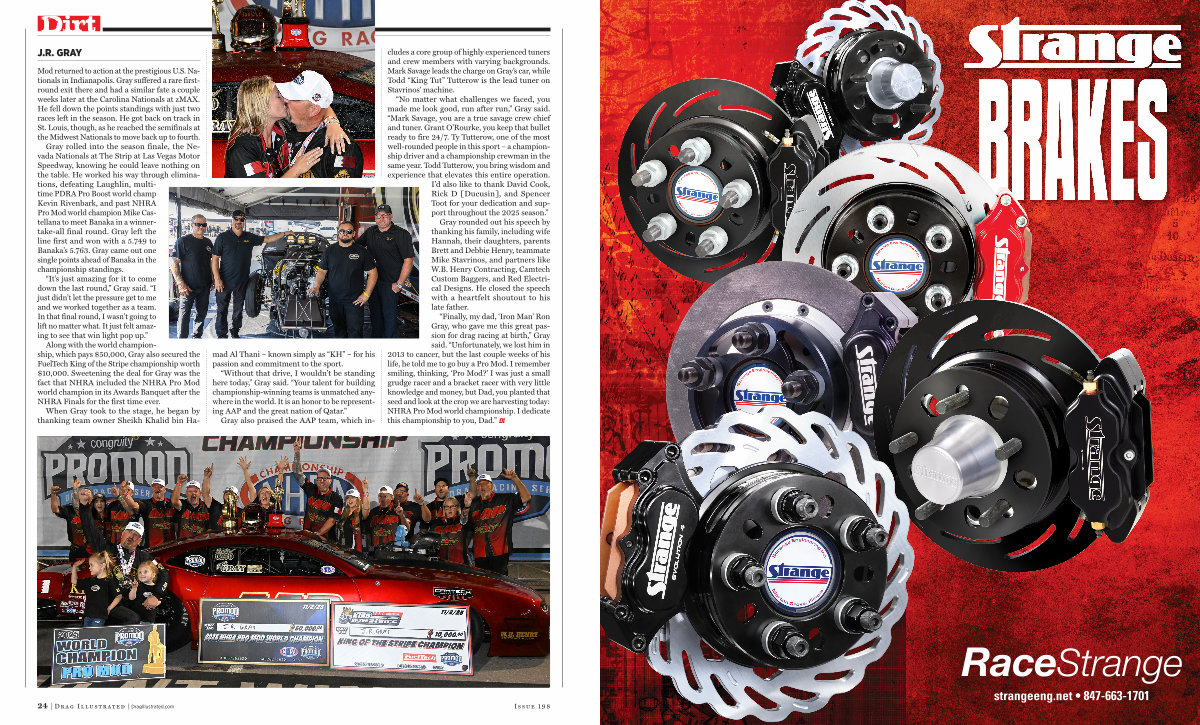 “ Finally, my dad,‘ Iron Man’ Ron Gray, who gave me this great passion for drag racing at birth,” Gray said.“ Unfortunately, we lost him in 2013 to cancer, but the last couple weeks of his life, he told me to go buy a Pro Mod. I remember smiling, thinking,‘ Pro Mod?’ I was just a small grudge racer and a bracket racer with very little knowledge and money, but Dad, you planted that seed and look at the crop we are harvesting today: NHRA Pro Mod world championship. I dedicate this championship to you, Dad.” DI