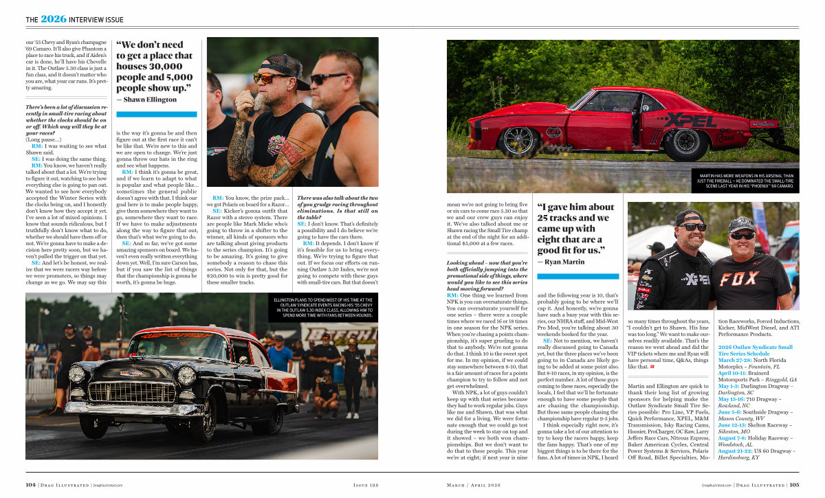 Martin and Ellington are quick to thank their long list of growing sponsors for helping make the Outlaw Syndicate Small Tire Series possible: Pro Line, VP Fuels, Quick Performance, XPEL, M & M Transmission, Isky Racing Cams, Hoosier, ProCharger, OC Raw, Larry Jeffers Race Cars, Nitrous Express, Baker American Cycles, Central Power Systems & Services, Polaris Off Road, Billet Specialties, Motion