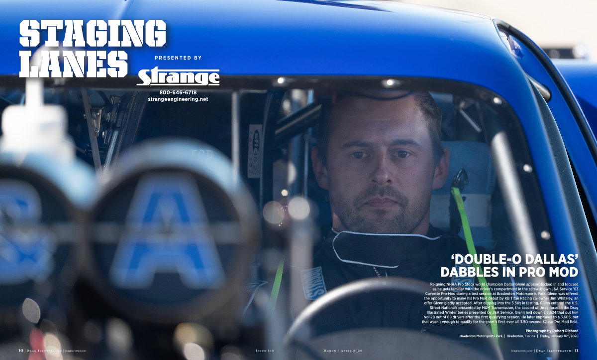 Reigning NHRA Pro Stock world champion Dallas Glenn appears locked in and focused as he gets familiar with the driver’ s compartment in the screw-blown J & A Service’ 63 Corvette Pro Mod during a test session at Bradenton Motorsports Park. Glenn was offered the opportunity to make his Pro Mod debut by KB Titan Racing co-owner Jim Whiteley, an offer Glenn gladly accepted. After dipping into the 3.50s in testing, Glenn entered the U. S.