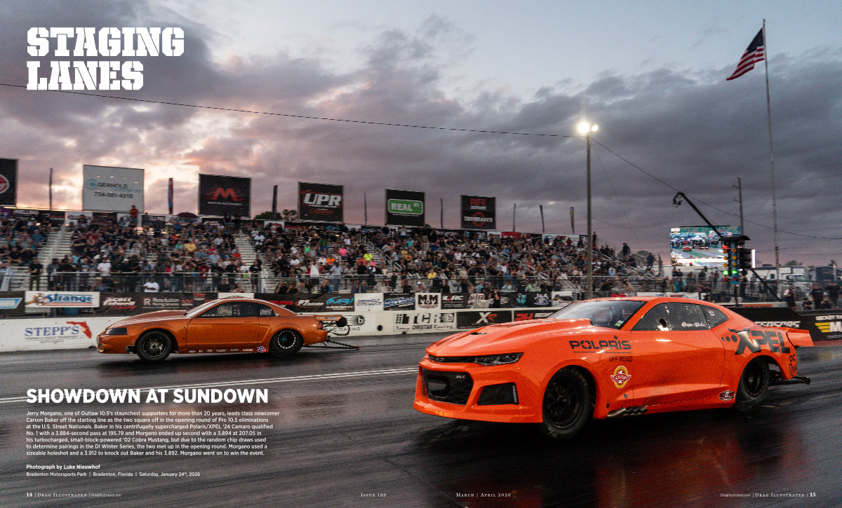 Jerry Morgano, one of Outlaw 10.5’ s staunchest supporters for more than 20 years, leads class newcomer Carson Baker off the starting line as the two square off in the opening round of Pro 10.5 eliminations at the U. S. Street Nationals. Baker in his centrifugally supercharged Polaris / XPEL’ 24 Camaro qualified No. 1 with a 3.884-second pass at 195.79 and Morgano ended up second with a 3.894 at 207.05 in his turbocharged, small-block-powered’ 02 Cobra Mustang, but due to the random chip draws used to determine pairings in the DI Winter Series, the two met up in the opening round. Morgano used a sizeable holeshot and a 3.912 to knock out Baker and his 3.892. Morgano went on to win the event.