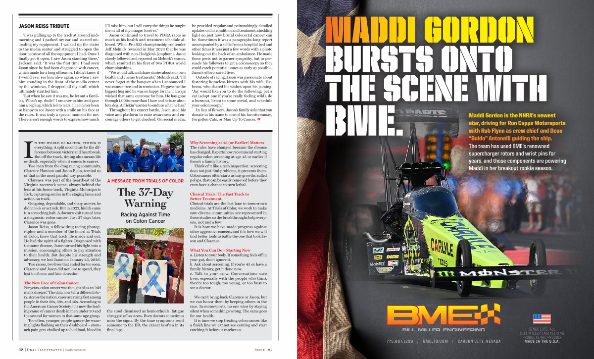 Jason Reiss, a fellow drag racing photographer and a member of the board at Trials of Color, knew that track life inside and out. He had the spirit of a fighter. Diagnosed with the same disease, Jason turned his fight into a mission, encouraging others to pay attention to their health. But despite his strength and advocacy, we lost Jason on January 23, 2026.