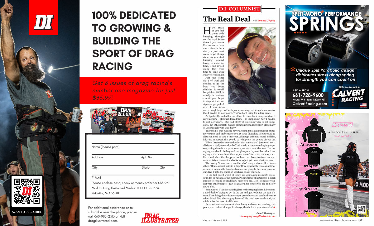 Just the other day, I left work and decided to go the back way home, thinking it would be quicker. Well, it usually is quicker – until you forget to stop at the stop sign and get pulled over. I was fortunate enough to get off with just a warning, but it made me realize that I needed to slow down. That’ s a hard thing for a drag racer.
