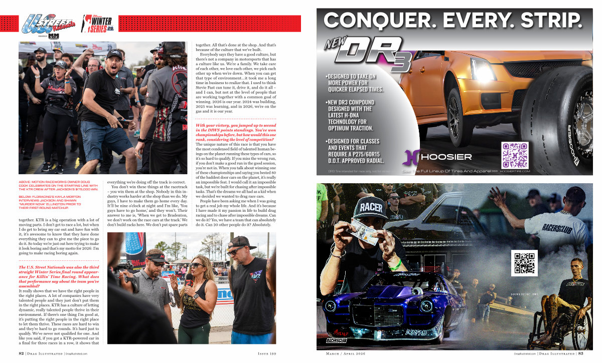 The U. S. Street Nationals was also the third straight Winter Series final round appearance for Killin’ Time Racing. What does that performance say about the team you’ ve assembled? It really shows that we have the right people in the right places. A lot of companies have very talented people and they just don’ t put them in the right places. KTR has a culture of letting dynamic, really talented people thrive in their environment. If there’ s one thing I’ m good at, it’ s putting the right people in the right place to let them thrive. These races are hard to win and they’ re hard to go rounds. It’ s hard just to qualify. We’ ve never not qualified for one. And like you said, if you got a KTR-powered car in a final for three races in a row, it shows that