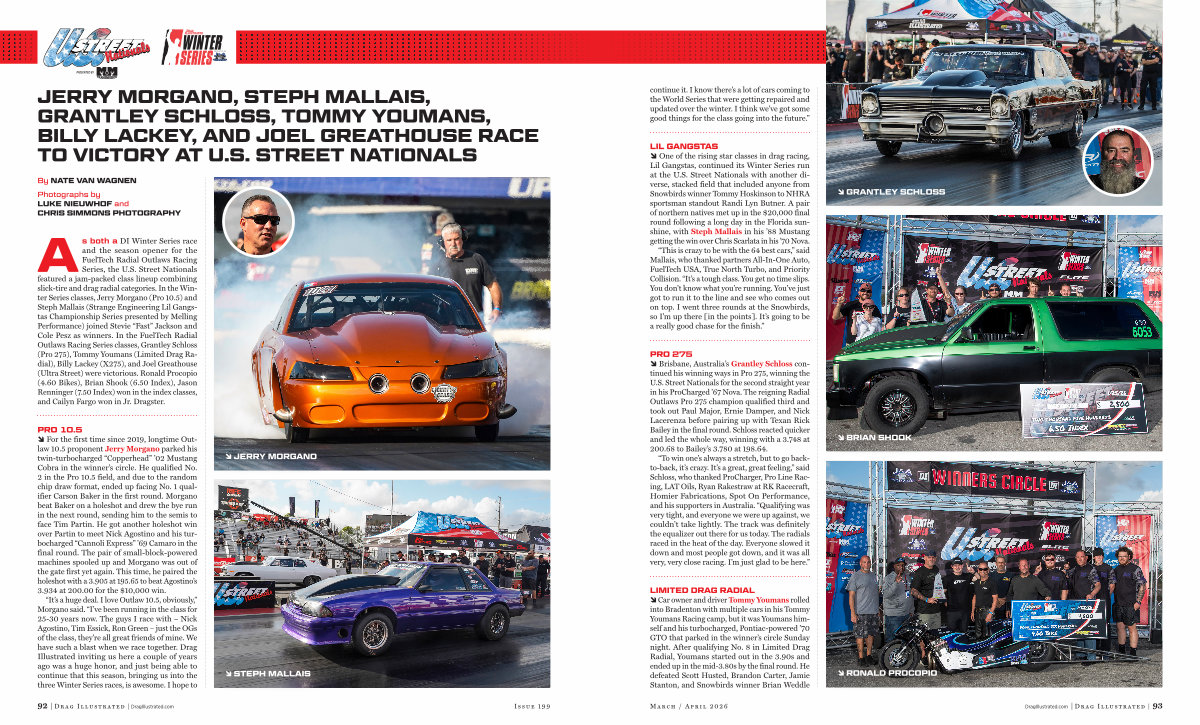 LIL GANGSTAS � One of the rising star classes in drag racing, Lil Gangstas, continued its Winter Series run at the U. S. Street Nationals with another diverse, stacked field that included anyone from Snowbirds winner Tommy Hoskinson to NHRA sportsman standout Randi Lyn Butner. A pair of northern natives met up in the $ 20,000 final round following a long day in the Florida sunshine, with Steph Mallais in his’ 88 Mustang getting the win over Chris Scarlata in his’ 70 Nova.